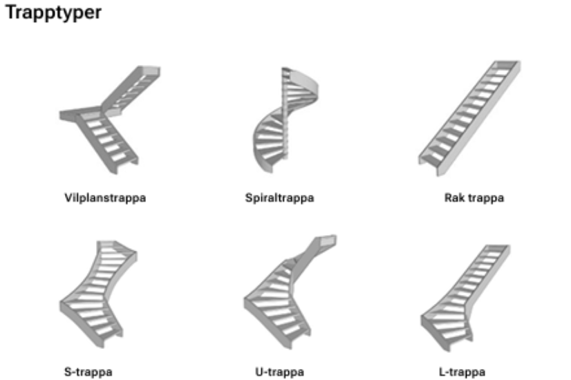 trappa kan designas, men standardformer passar oftast de flesta behov. De vanligaste trappformerna bland våra kunder är: